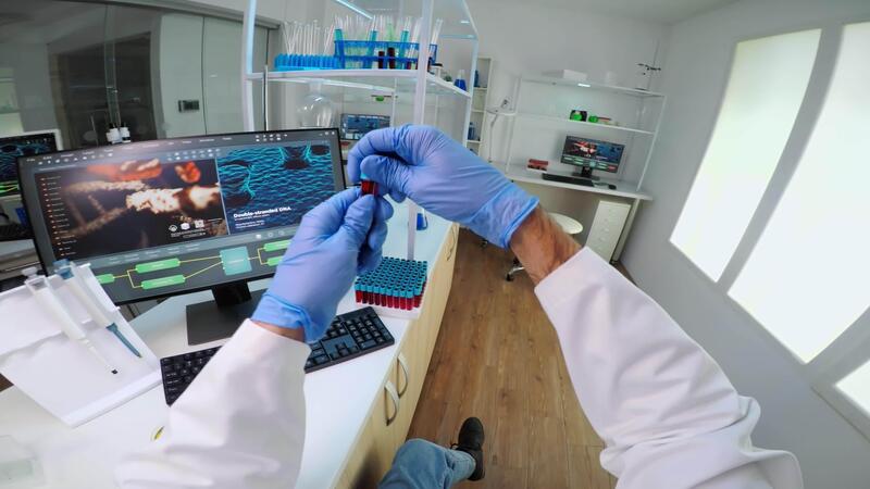 POV of scientist using micropipette for analysing blood sample putting in petri dish. Team of researchers examining virus evolution using high tech for vaccine development against covid19 Pro Video