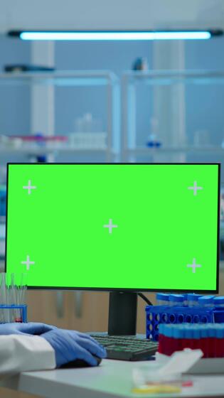 Vertical . Man researcher looking at chroma key display in modern equipped lab typing on computer. Team of microbiologists doing vaccine research writing on device with green screen, isolated, mockup display. Pro Video