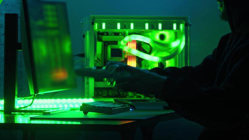 Hacker picks up the headphones from the table and places them on his head, then begins typing code on the keyboard. Close up. Slow motion. Pro Video