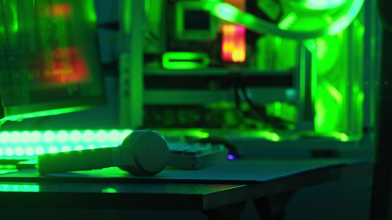 Close-up shot of headphones and a keyboard lying on a hacker's desk, with neon green lighting blinking in the background. Close up. Slow motion. Pro Video