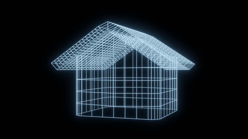 3d house illustration with glowing net framework concept. Futuristic building technology rotating on black background Free Video