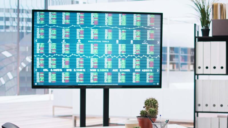 Big screen in financial department office shows stock exchange indices changing in real time. Display in empty workplace with trading indexes showing latest price modifications, camera A Pro Video