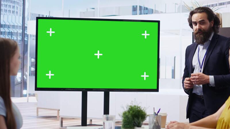 Financial adviser presents market analytics on green screen display to clients, teaching them how to build portfolio. Broker showing stock exchange charts on mockup device to family, camera B Pro Video