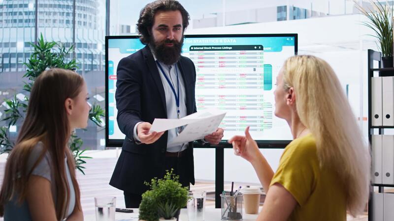 Financial advisor discussing with clients, recommending suitable financial products such as mutual funds. Agent teaching parent and daughter how to invest, offering statistical graphs, camera A Pro Video