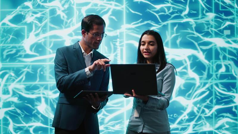 IT department colleagues solving tasks on laptop and tablet, running artificial intelligence programming scripts. Team of engineers brainstorming ways to develop AI applications, camera A Pro Video