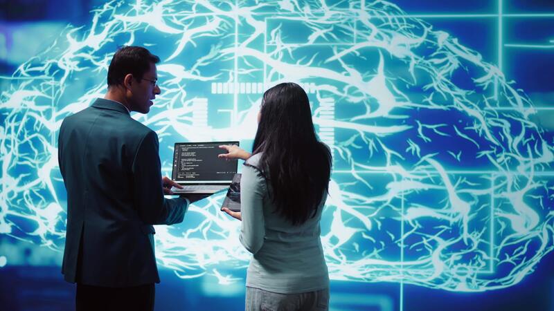 Coworkers doing brainstorming, using devices to fix artificial intelligence neural networks. High tech workspace colleagues using AI system aiding in processing and transmitting information, camera B Pro Video