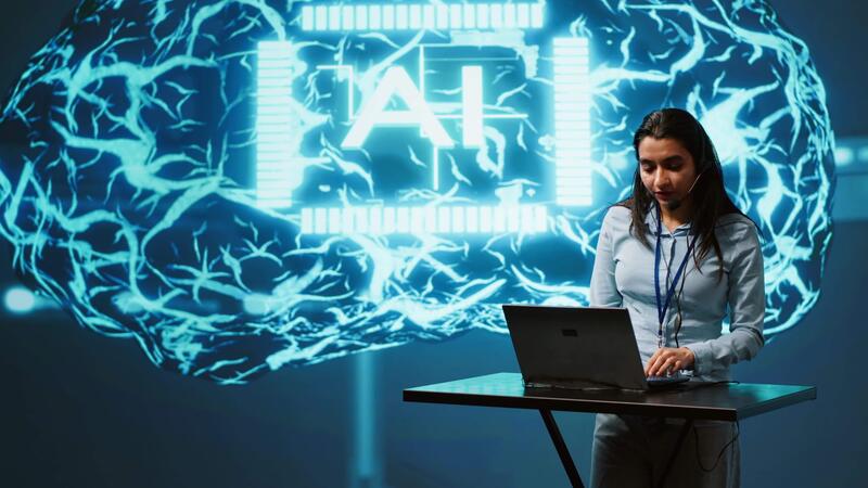 Technician in high tech workspace managing call center tasks, speaking into headset while doing monitoring with laptop. AI company employee talking with clients through headphones mic, camera A Pro Video