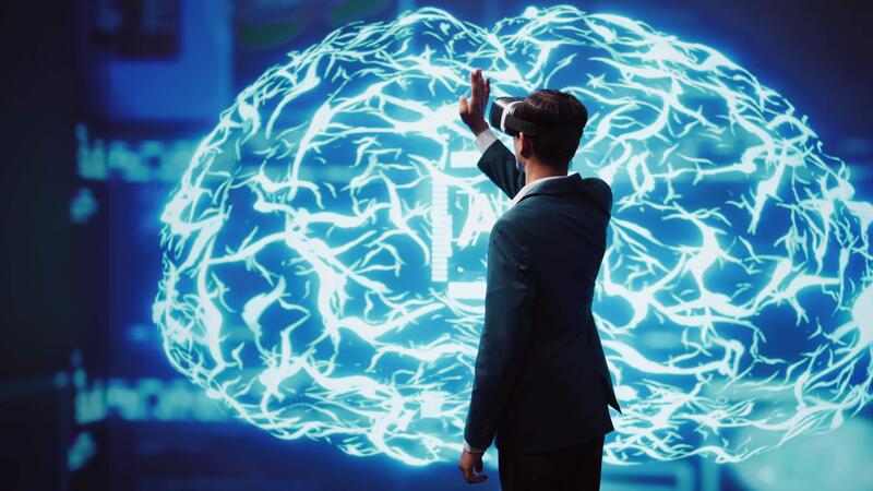 Computer scientist wearing VR headset looking at hologram of artificial intelligence human brain simulation. Indian man interacting with AI visualization showing machine learning algorithms, camera B Pro Video