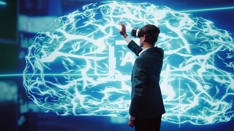 Developer wearing VR smart goggles working with artificial intelligence neural networks. IT expert using virtual reality tech and AI systems in futuristic workspace, camera B Pro Video
