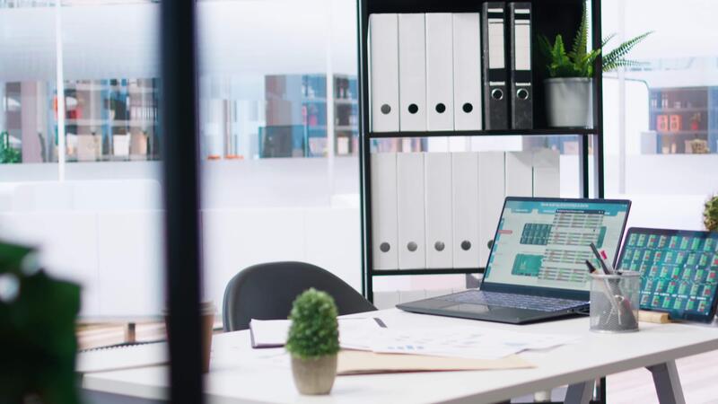 Empty company financial department with stock portfolio on laptops containing collection of investment assets. Workspace with live index indices on notebook screen showing stock demand surge Pro Video
