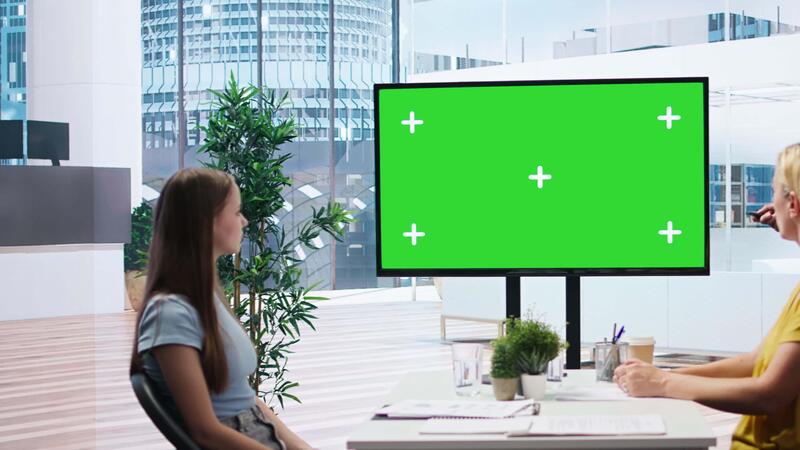 Financial adviser presents market analytics on green screen display to clients, teaching them how to build portfolio. Broker showing stock exchange charts on mockup device to family, camera A Pro Video