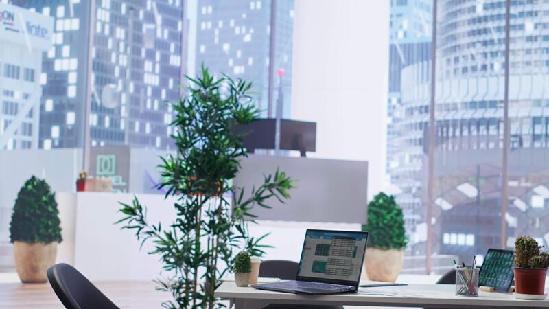 Laptop on desk in office showing stock exchange indices changing in real time. Notebook in workplace with forex trading indexes displayed live showing latest price modifications Pro Video