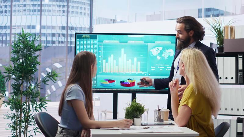 Financial adviser presents market analytics to customers using large display, emphasizing data driven decision making. Broker agent showing statistical graphs about stock exchange shares, camera B Pro Video