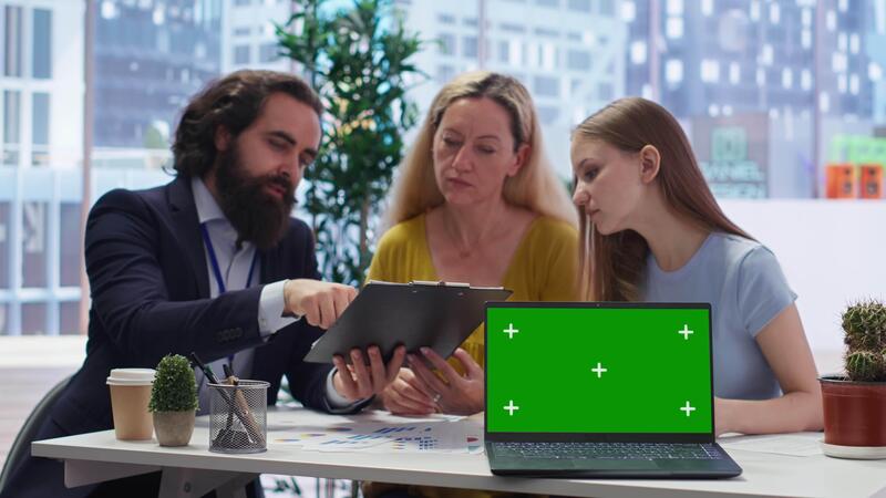 Financial adviser assisting clients in setting up investment accounts with isolated screen laptop, close up. Consultant uses financial planning software on chroma key notebook to help family, camera B Pro Video