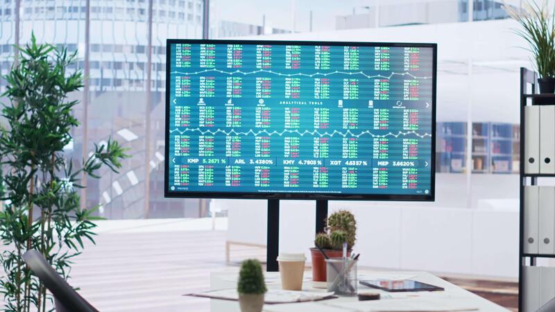 Big screen in financial department office shows stock exchange indices changing in real time. Display in empty workplace with trading indexes showing latest price modifications, camera B Pro Video