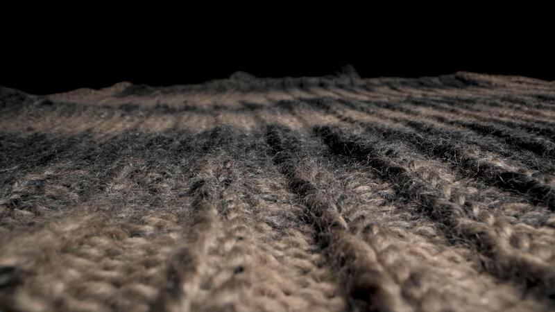 A close up view of knitted wool fabric in brown and gray. The fabric is textured and has a soft, fuzzy look. It appears to be thick and warm. Pro Video