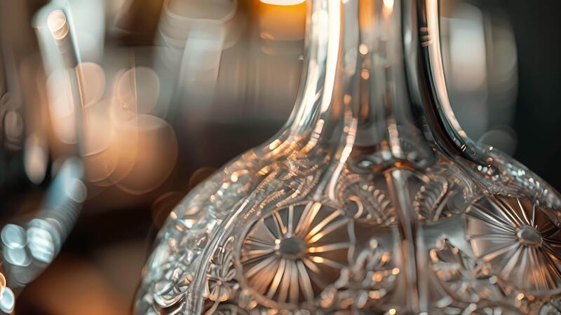 A detailed image of a wine decanter with intricate patterns etched into the glass. The decanter not only serves a functional purpose but also adds a touch of sophistication to the win Pro Video