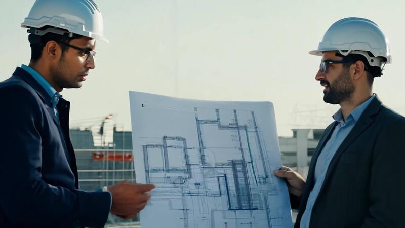 Architects and engineers discussing blueprints at a construction site, with the building framework visible in the background. The interaction and planning process are the focus. Free Video