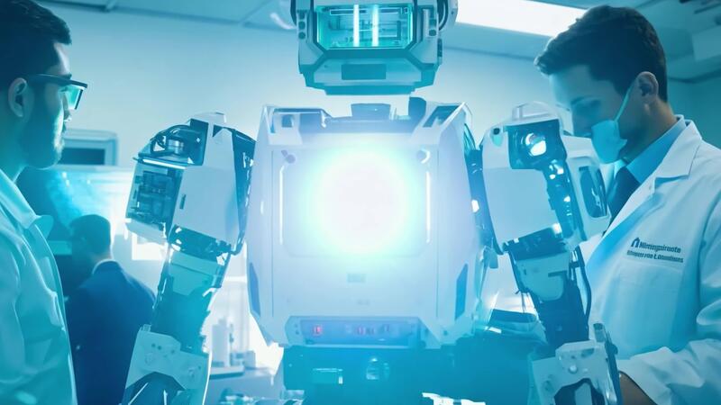 Engineers working on a sleek, futuristic robot, assembling and testing its functions in a well-lit lab. Free Video
