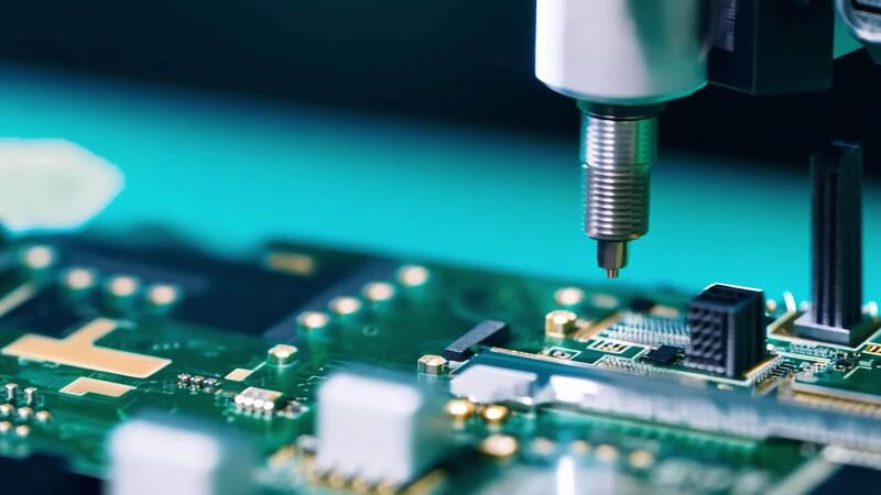 Circuit board assembly, focusing on a robotic arm placing tiny components with precision. Free Video