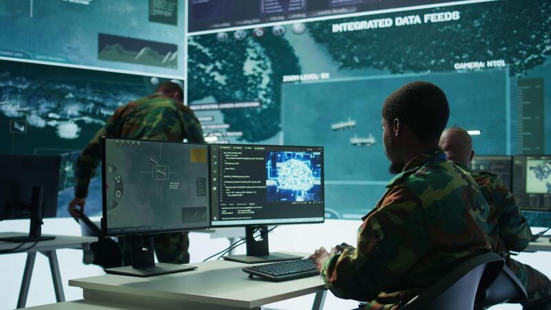 Programming engineer soldier handles AI brain and deep learning data on computer in command post, coordinates national defense operations. Neural network artificial intelligence science. Camera B. Pro Video