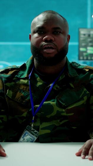 Vertical Reconnaissance expert engages in a online videocall in a high tech control room, coordinating intelligence and surveillance efforts with remote teams to enhance national defense program. Camera A. Pro Video