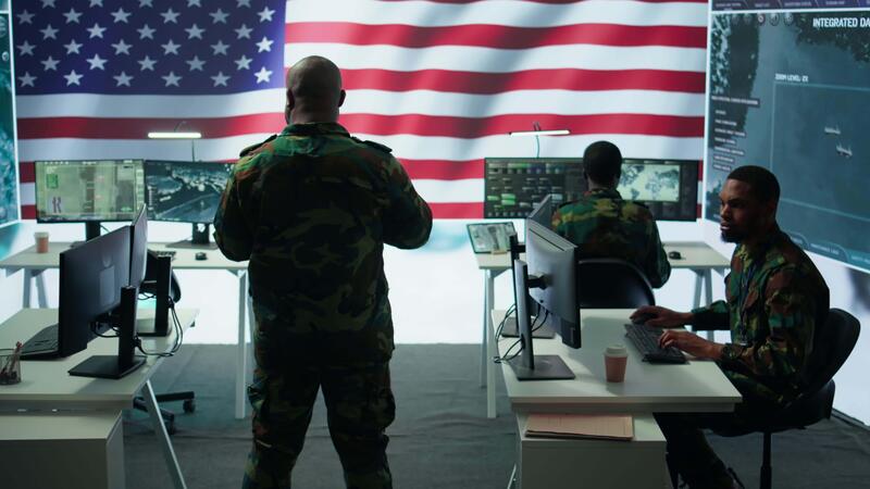 Team of military experts operates high tech computers and tablet to analyze surveillance data and manage national security operations. Working with CCTV radar satellite imagery. Camera B. Pro Video