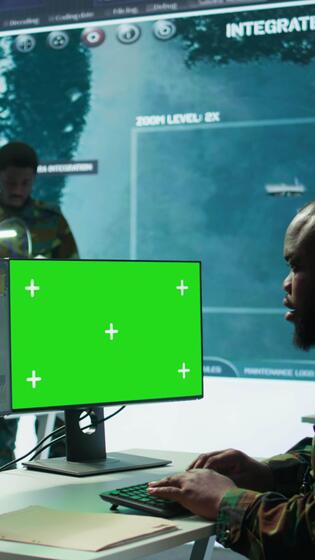 Vertical Soldier analyzing real time data next to green screen in high tech military office, processing intelligence for field operations and coordinating strategic missions to ensure national interests. Camera B. Pro Video