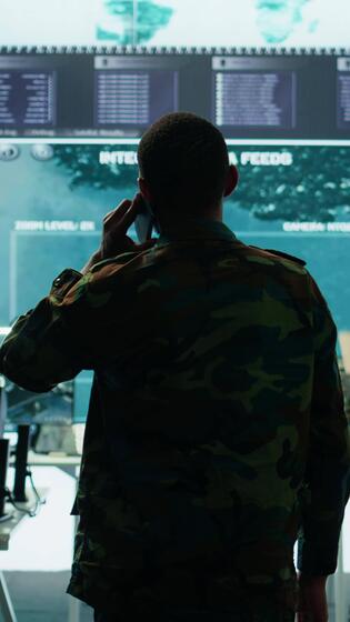 Vertical Military man answers phone call in a mission control center, working with advanced technology and satellite imagery to track potential threats and real time data. Intelligence activities. Camera B. Pro Video
