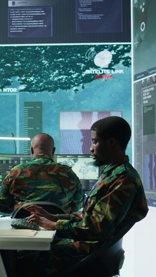 Vertical High tech military office with soldiers analyzing real time data, processing intelligence information and coordinating strategic operations to support army field missions effectively. Camera B. Pro Video