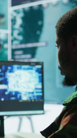 Vertical IT programming technician gathering information via neural network and artificial intelligence, employing programming language and new technology to help army operations. Deep learning. Camera B. Pro Video