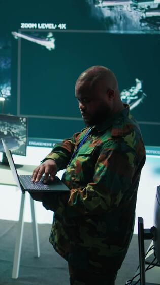 Vertical Military specialists work in a high tech command post center, focusing on cybersecurity, surveillance and data protection to ensure the security and integrity of national information. Camera B. Pro Video