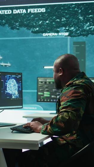 Vertical Cloud computing expert using new technology AI brain to learn intelligence for national defense missions, operating laptop to gather information from cctv systems. Neural network. Camera B. Pro Video