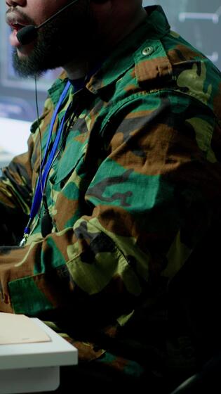 Vertical Military control room features army personnel monitoring surveillance systems, soldiers integrating data and coordinating strategic missions. Support decision making and efficiency. Camera A. Pro Video