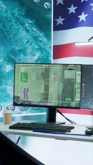 Vertical Empty modern base of operations used by the US military armed forces, safeguarding state secrets and ensuring security protocols. High tech surveillance gear used for intelligence. Camera A. Pro Video