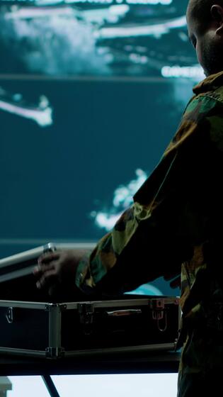 Vertical Army espionage specialist in a control center collecting satellite cctv data real time surveillance, strategic military operations. Working to ensure national security and protocols. Camera A. Pro Video