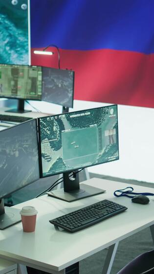 Vertical Empty russian army command center with a big screen showing the national flag, working on spreading fake news and propaganda to inflict fear and misinformation. Terrorist ideology. Camera B. Pro Video