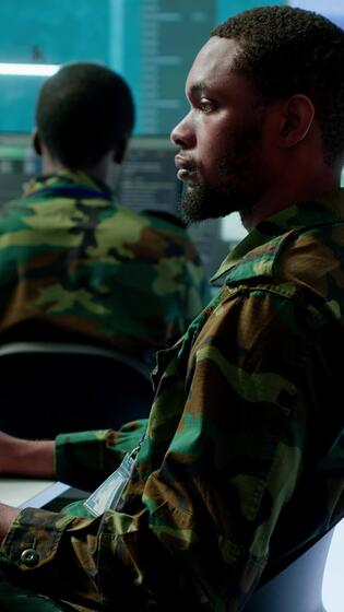 Vertical Military personnel in a high tech command center monitor satellite feeds, coordinate intelligence operations. Maintaining national security and supporting strategic army missions. Camera A. Pro Video
