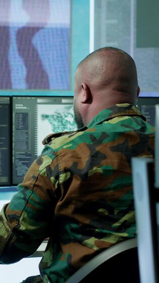 Vertical High tech military office with soldiers analyzing real time data, processing intelligence information and coordinating strategic operations to support army field missions effectively. Camera A. Pro Video