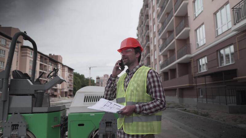 Engineer talking on phone with documents and plans in hands in front construction equipment at building site of apartment block. Supervisor in hard hat with heavy machinery at development site. Pro Video