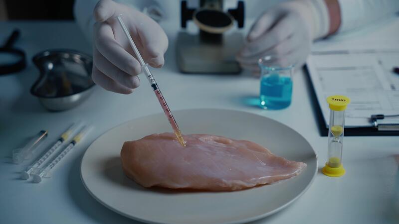 Food quality control concept. Lab assistant testing GMO chicken. Scientist examining sample meat, syringes with anabolic and antibiotics, microscope in laboratory. Food bio engineering process. Pro Video