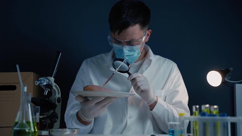 Laboratory assistant with magnifying glass examining raw meat. Detection of poison. Scientist testing GMO chicken in chemical lab. Man looking at meat sample though magnifying glass, product quality. Pro Video