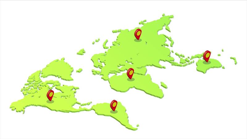Isometric world map with location pointers in several regions and dynamic connecting lines Pro Video