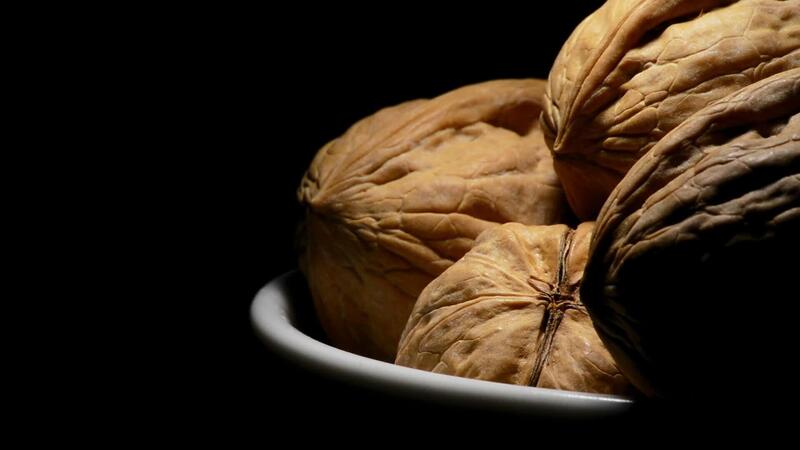 Walnuts nuts in a bowl at right of screen in rotation on black background Pro Video