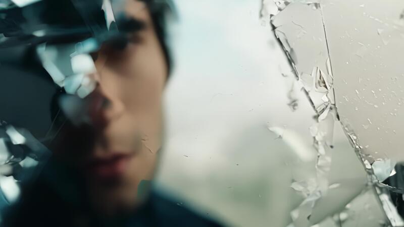 Closeup of a persons face shot through a shattered reflective surface distorting their features and adding a surreal quality to the image.. Pro Video