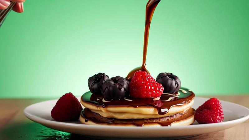 A hand drizzling chocolate syrup over a stack of fluffy pancakes topped with fresh berries. Green screen backdrop. Soft, diffused lighting to create a breakfast feel. Free Video