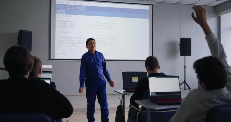 Classmates Discussing Program Code, Schoolboy Speaking In Front Pupils In Classroom, Coding Classes Pro Video