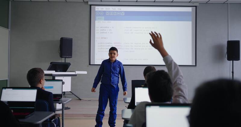Smart Schoolboy Speaking In Front Classmates In Classroom, Presenting Program Code In Class Pro Video