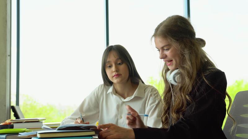 Two female students sitting by desk in lecture hall and discussing passage in book while one of them pointing at page Pro Video