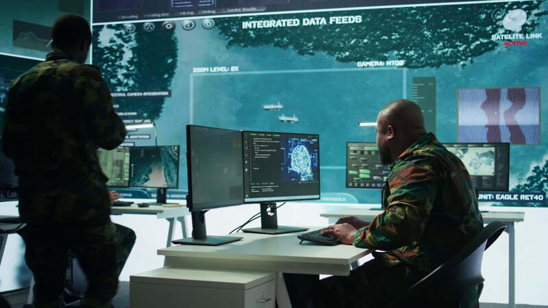 Cloud computing expert using new technology AI brain to learn intelligence for national defense missions, operating laptop to gather information from cctv systems. Neural network. Camera B. Pro Video